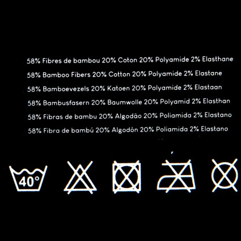 - 58% fibres de bambou, 20% coton, 20% polyamide, 2% élasthanne