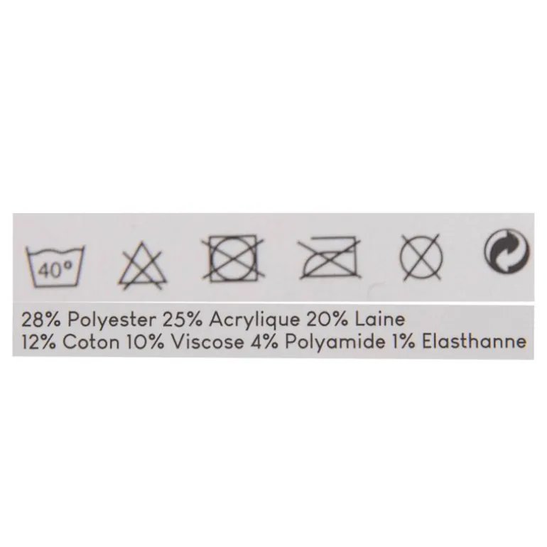 - 28% polyester / 25% acrylique / 20% laine / 12% coton / 10% viscose / 4% polyamide / 1% elasthanne