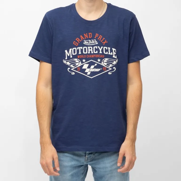 - Inscription « GRAND PRIX » et « MOTORCYCLE WORLD CHAMPIONSHIP » en blanc et rouge. Motif de forme diamant avec des ailes stylisées et un drapeau à damier.Logos **Von Dutch** et **MotoGP™ 49** intégrés au motif.